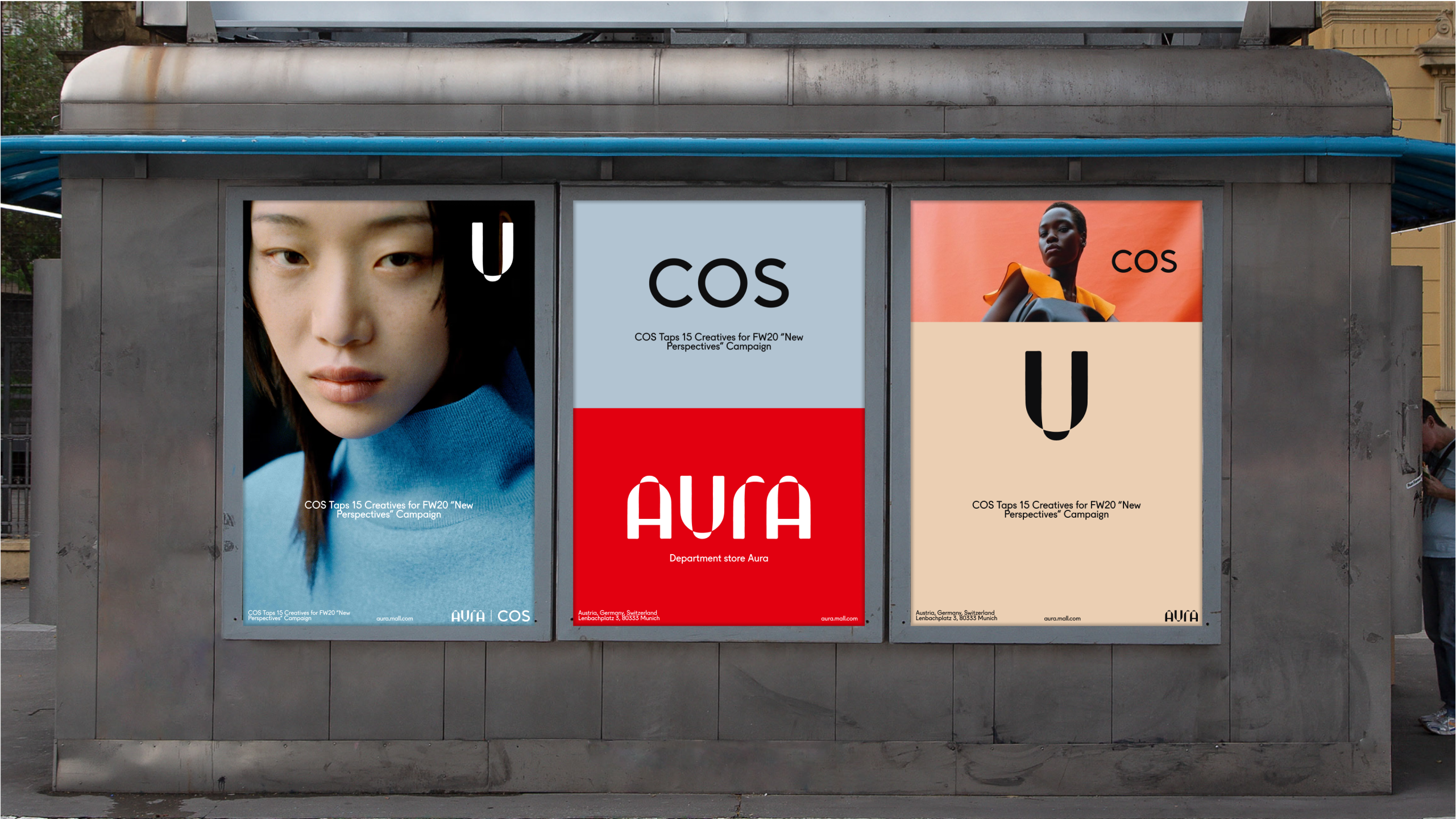 This approach also offers a playful and lightweight branding tool: by simply adding the handle to any visual, it instantly becomes part of Aura’s world. Whether it's a fashion shoot, a campaign image, or a product — the identity adapts without overcomplicating or overriding existing brand tones. The same shape forms the basis of the logo and graphic language, reflecting the tactile, carry-away nature of offline shopping in a flexible and minimal way.