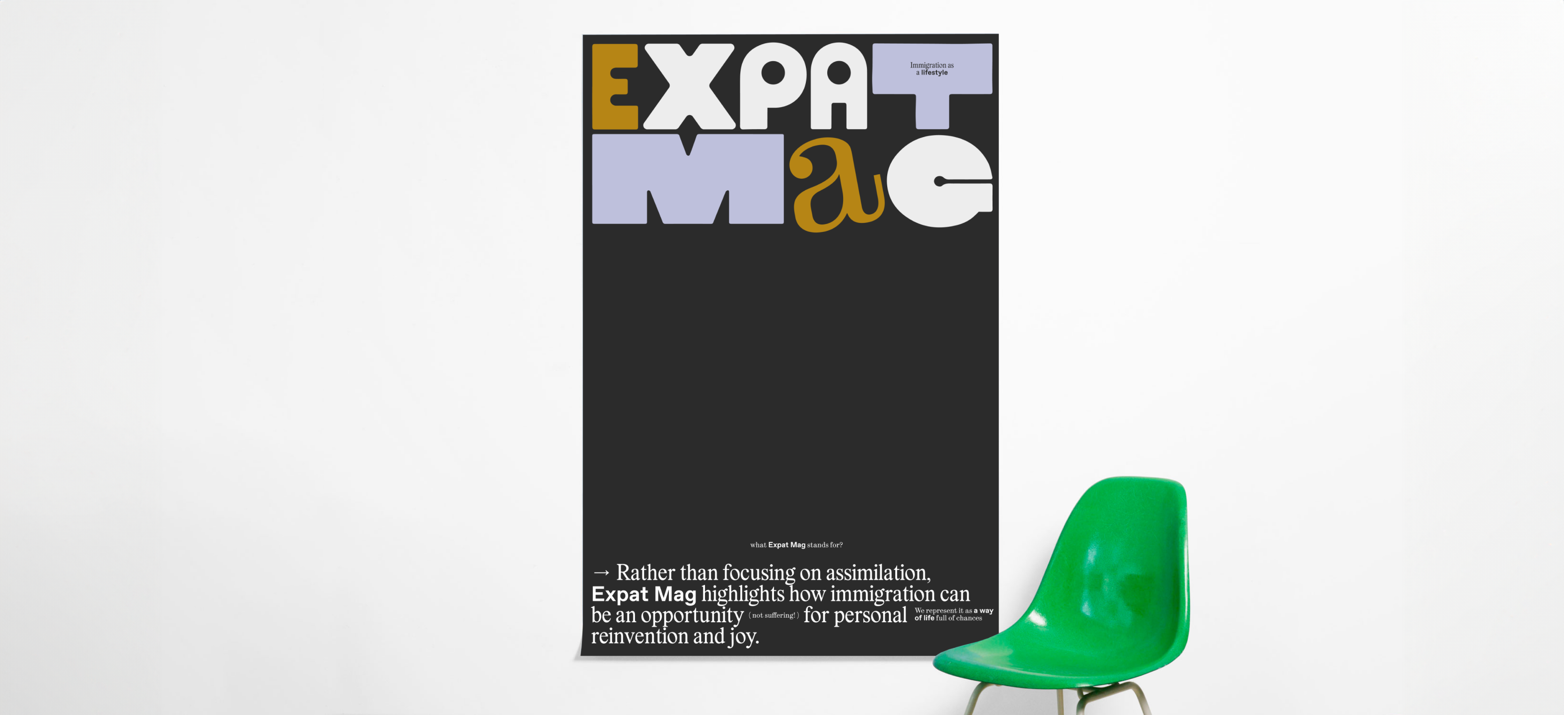 As Expat Mag was conceived as both a media brand and a publication, the visual identity naturally extends into print. The first issue of the magazine puts the concept into physical form, continuing the exploration of immigration as a lifestyle.