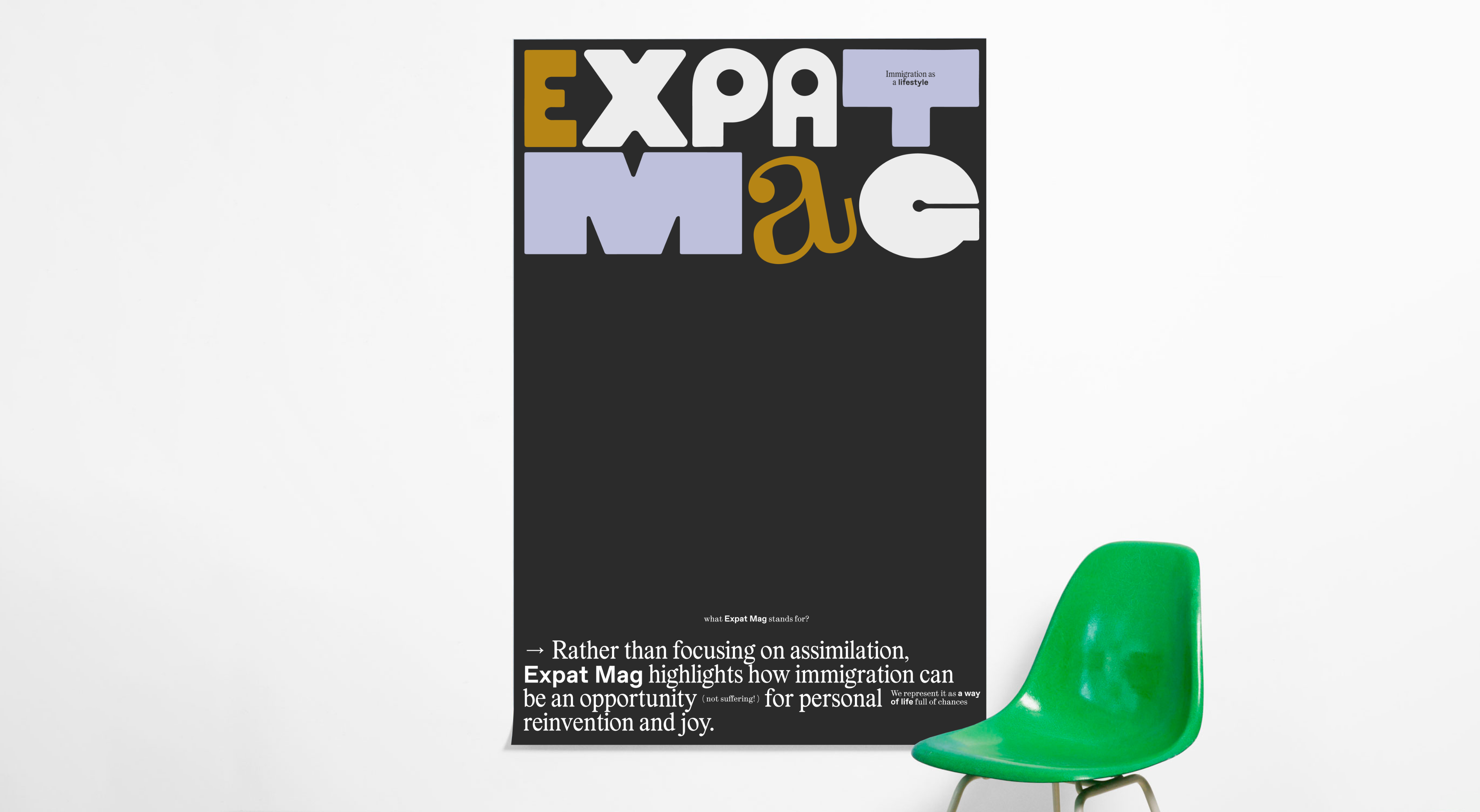 As Expat Mag was conceived as both a media brand and a publication, the visual identity naturally extends into print. The first issue of the magazine puts the concept into physical form, continuing the exploration of immigration as a lifestyle.
