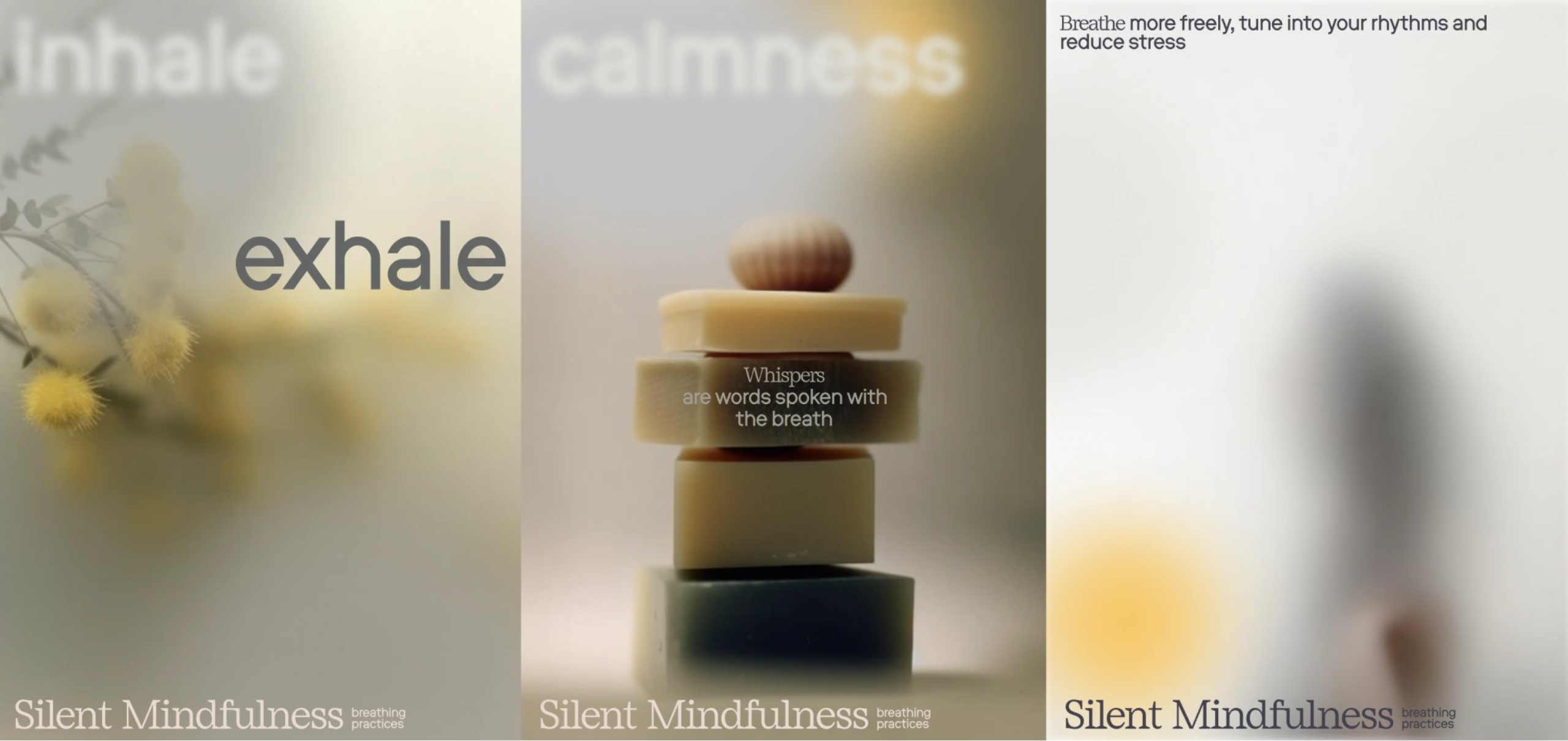 The visual identity is built around the idea that a whisper is a word spoken with breath — and breath itself is invisible. This became the core of the design language: typography is softened and blurred, as if spoken quietly and fading into air. The visual system feels weightless and open, with diffused gradients and layered space creating a sense of presence without clear form. The design avoids sharpness and contrast, aiming to reflect the softness of attention and the immersive quality of breathing itself.